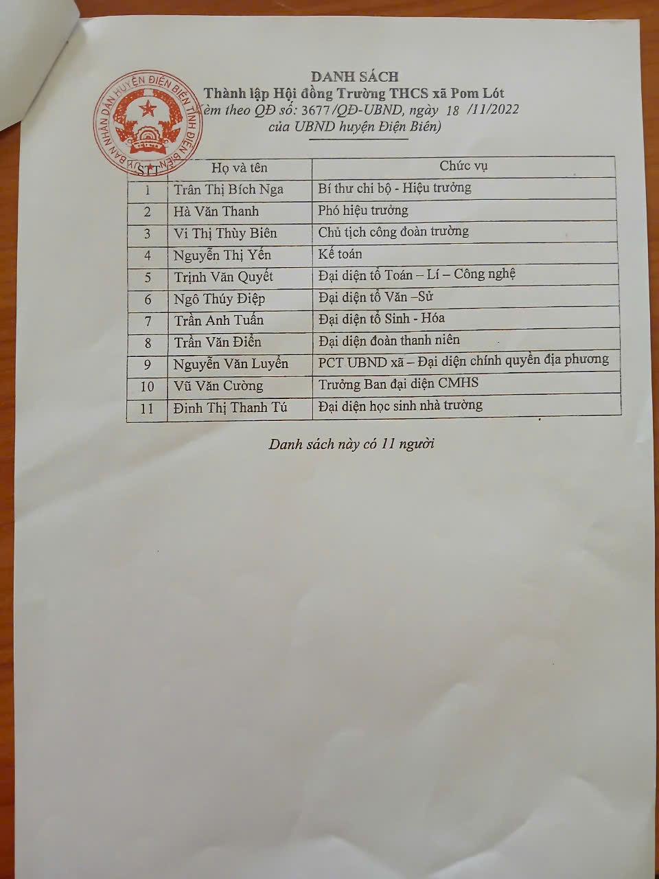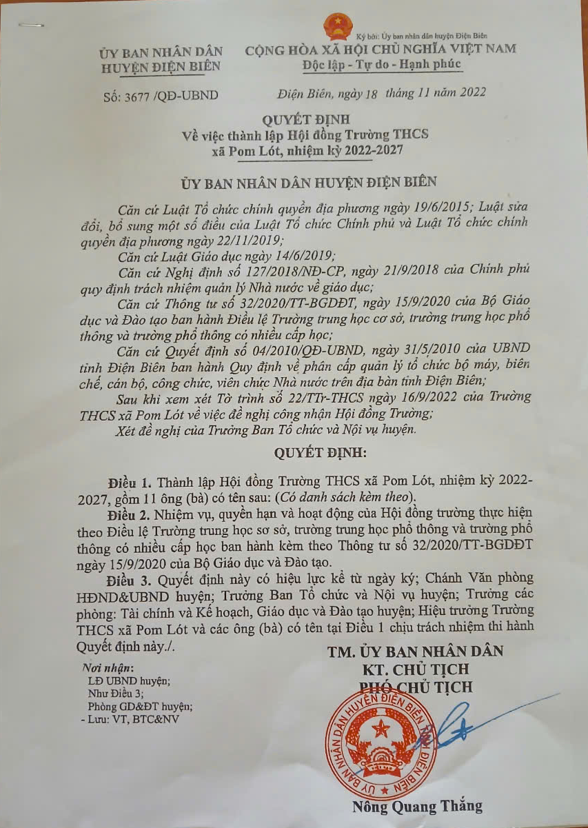 QĐ V/v thành lập hội đồng trường THCS xã Pom Lót, nhiệm kỳ 2022-2027