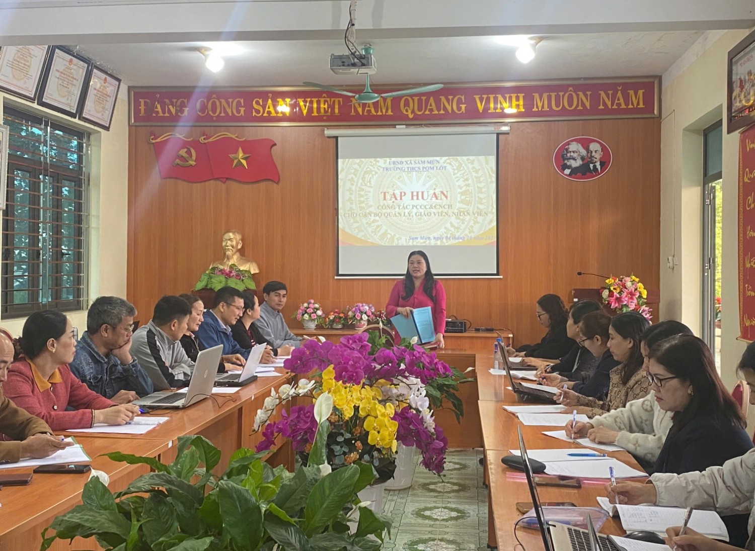 Ngày 04 tháng 10 năm 2025, trường THCS Pom Lót tổ chức tập huấn PCCC và CNCH cho tập thế CBGV; người lao động và học sinh nhà trường.