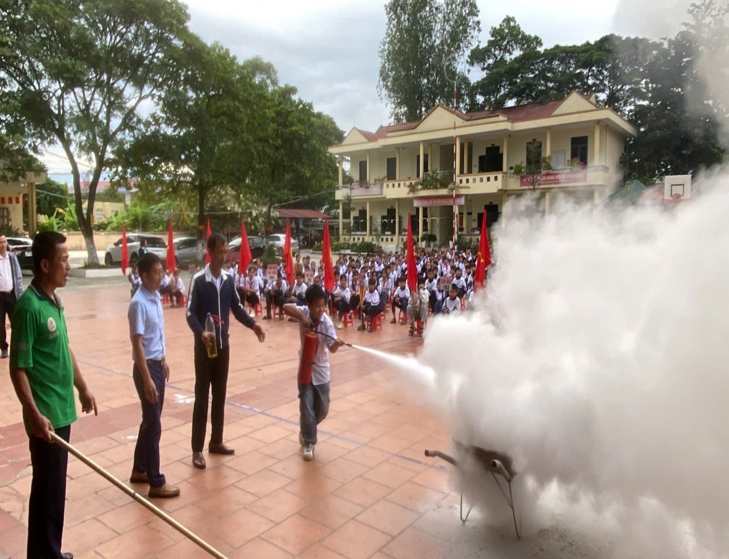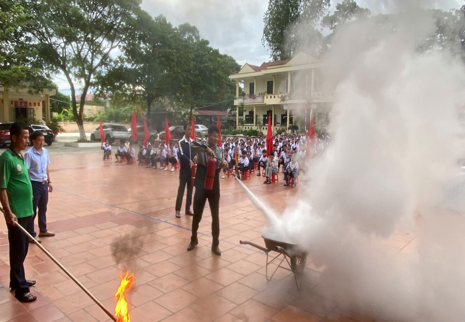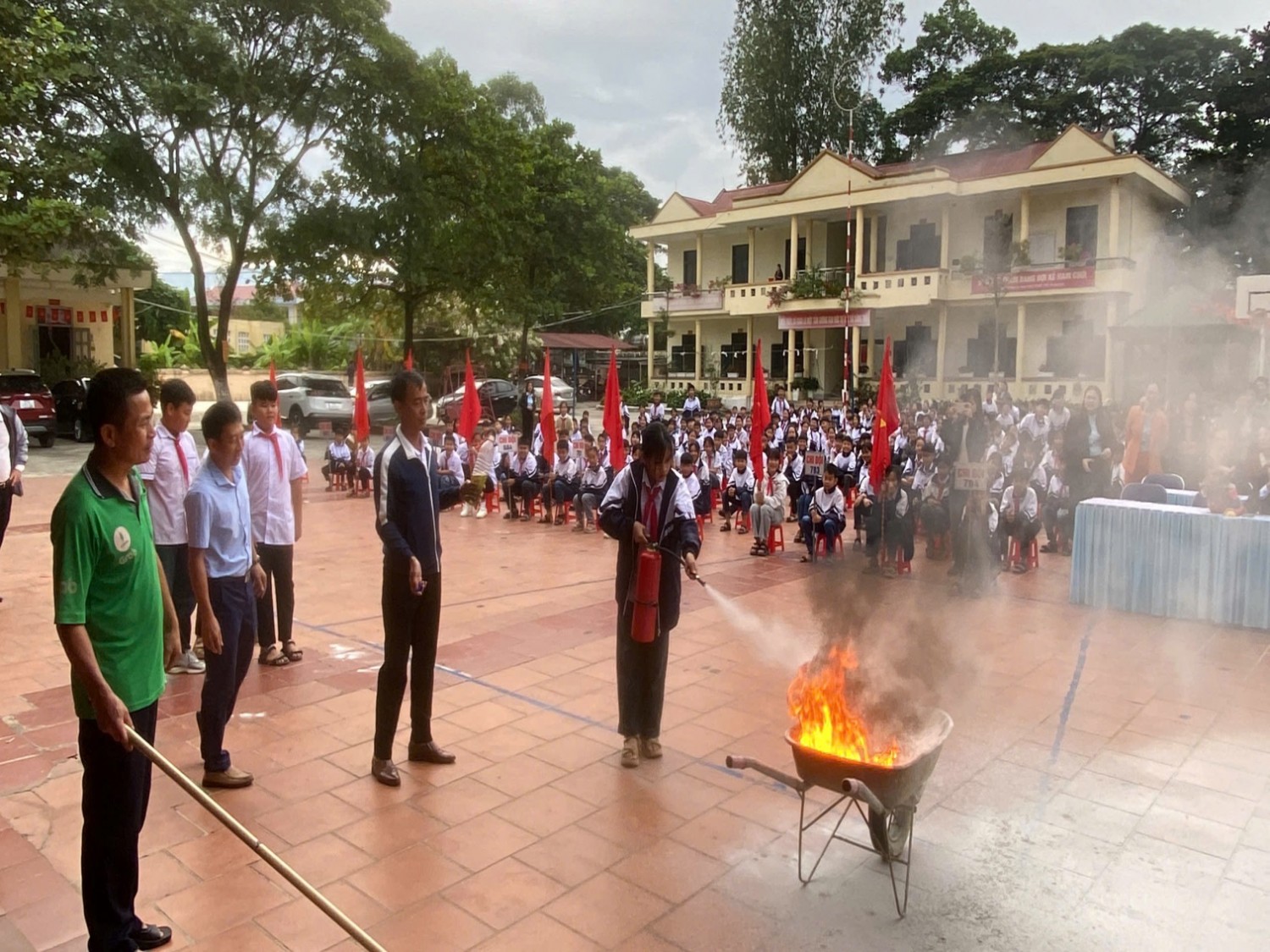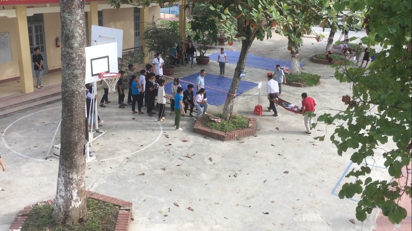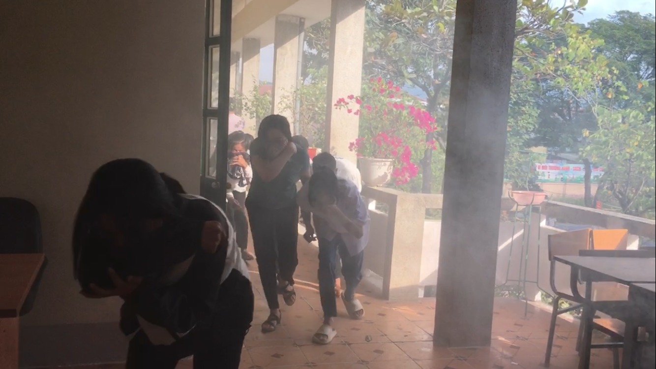CBGV; người lao động và học sinh của nhà trường đã tham gia diễn tập tình huống giả định PCCC và CNCH khi chập điện cháy phòng Thực hành Tin Học ở tầng 2 và phòng học ở tầng 1. CBGV; người lao động và học sinh của nhà trường biết sử dụng bình chữa cháy, Chăn Chiên dập lửa. Biết cách di chuyển khi gặp hỏa hoạn, biết sơ cứu người gặp nạn…