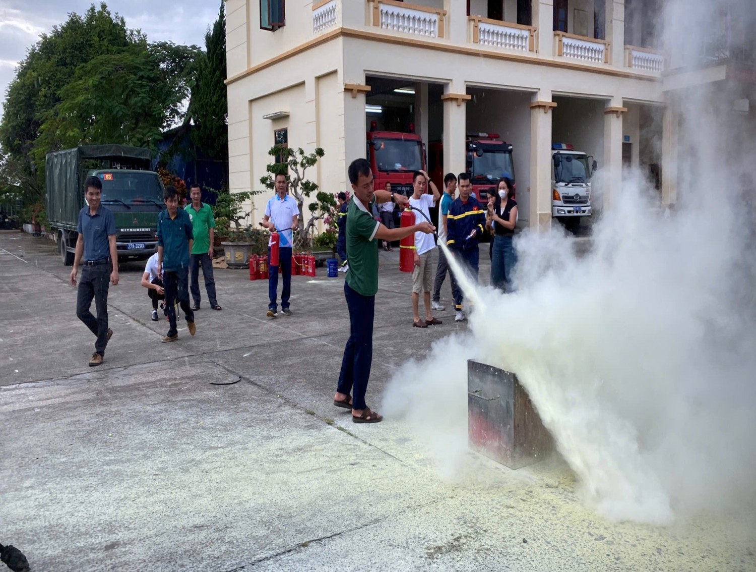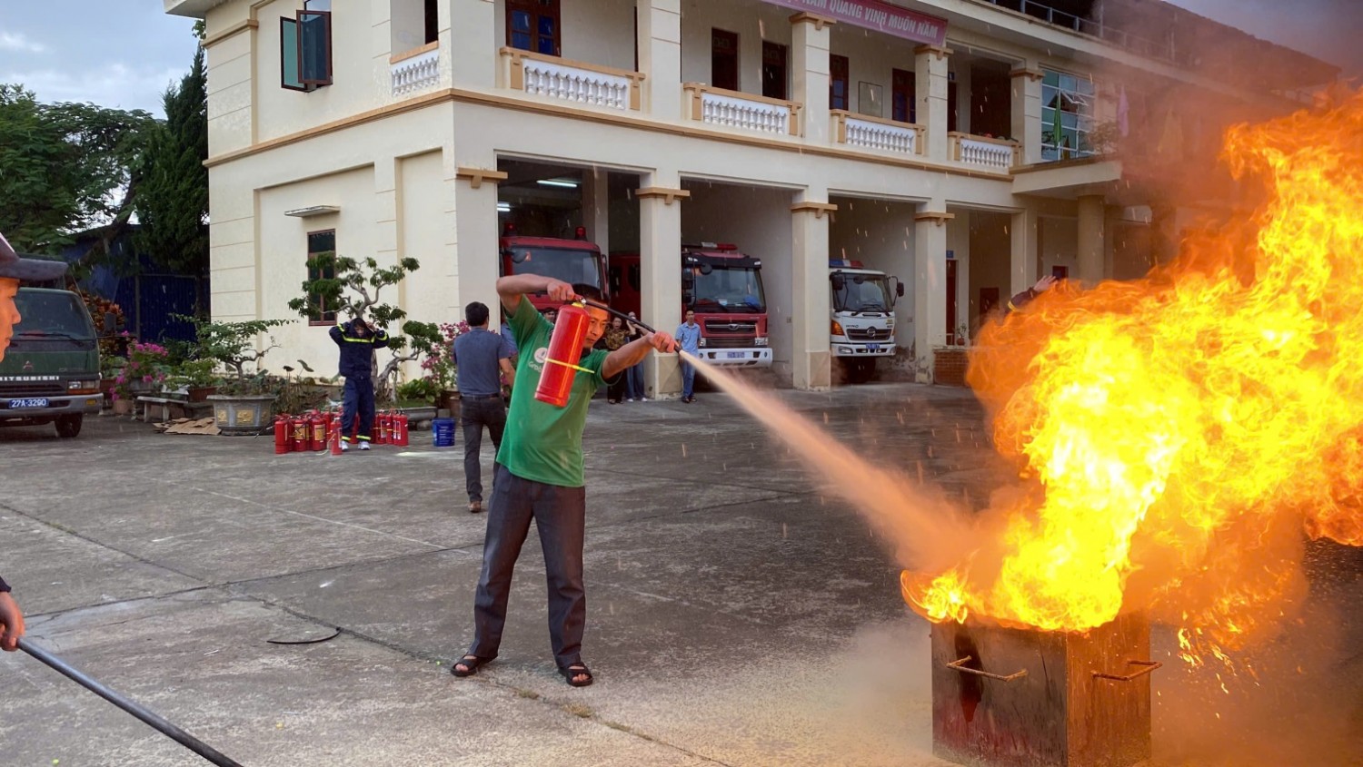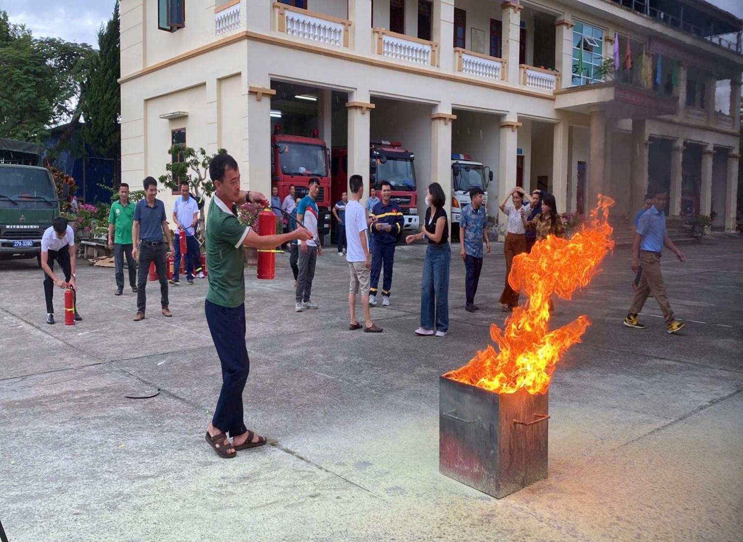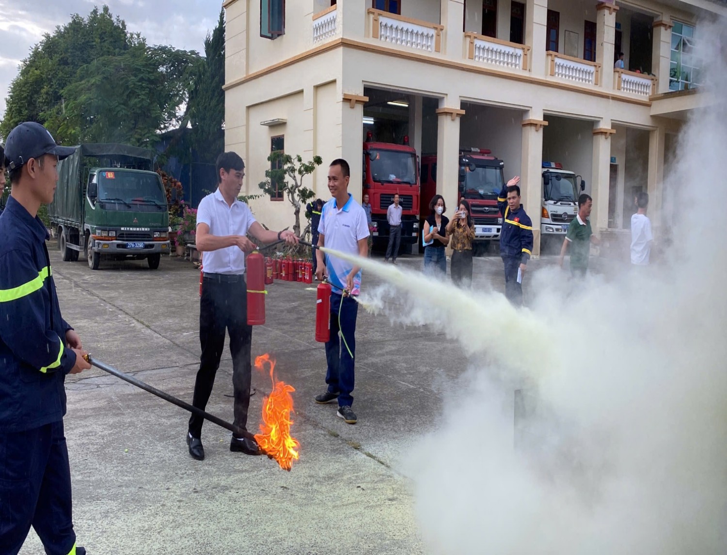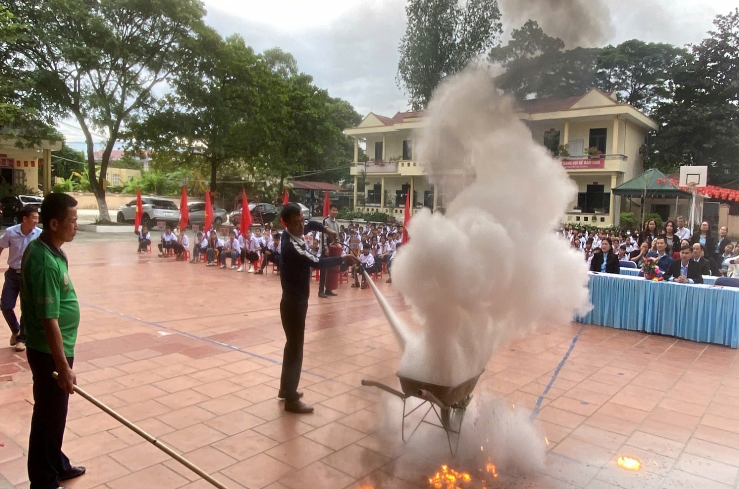 CBGV; người lao động và học sinh của nhà trường đã tham gia diễn tập tình huống giả định PCCC và CNCH khi chập điện cháy phòng Thực hành Tin Học ở tầng 2 và phòng học ở tầng 1. CBGV; người lao động và học sinh của nhà trường biết sử dụng bình chữa cháy, Chăn Chiên dập lửa. Biết cách di chuyển khi gặp hỏa hoạn, biết sơ cứu người gặp nạn…