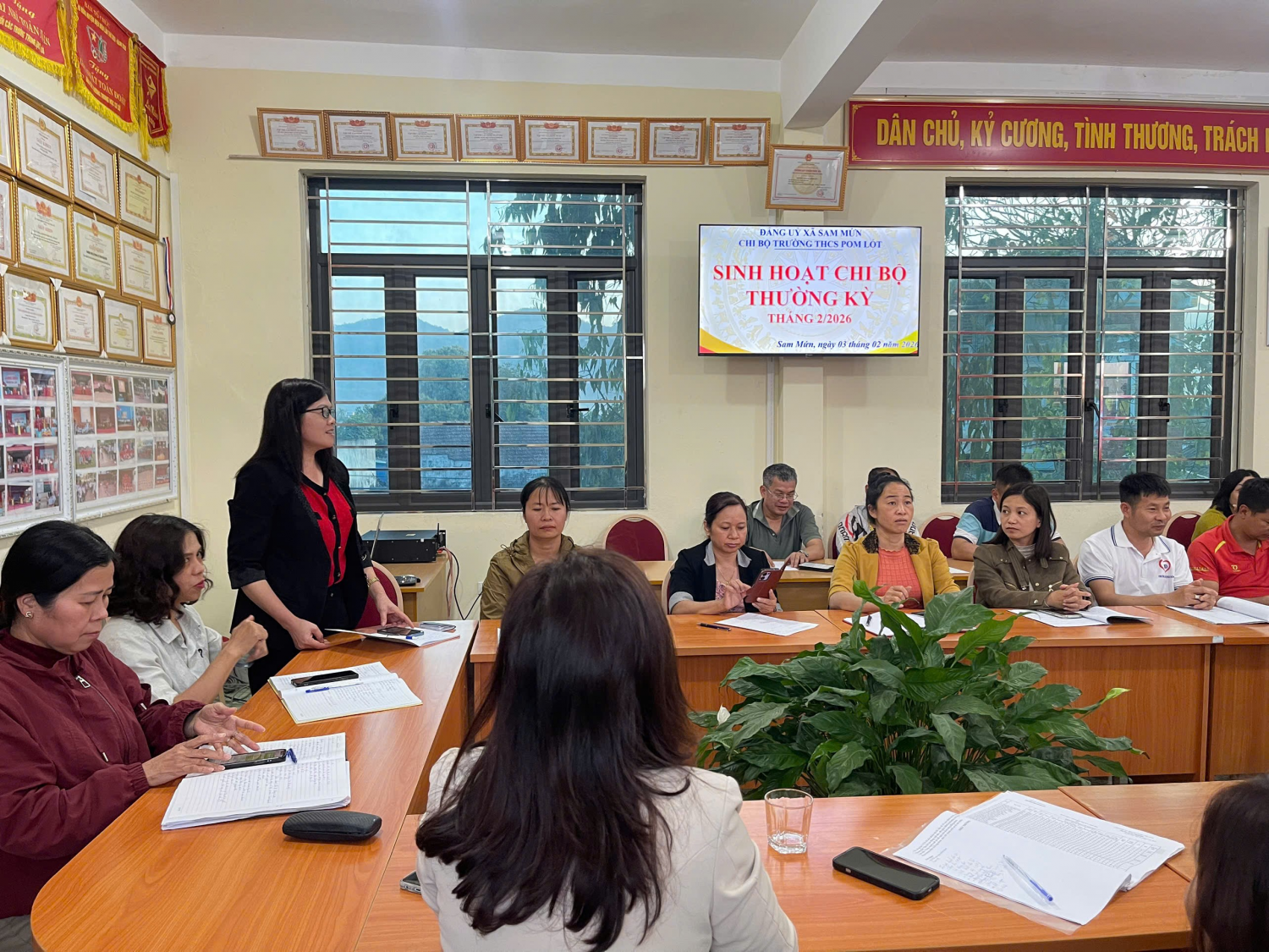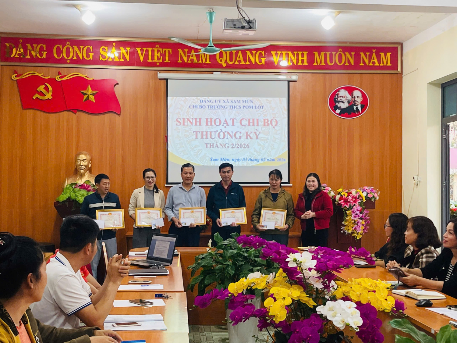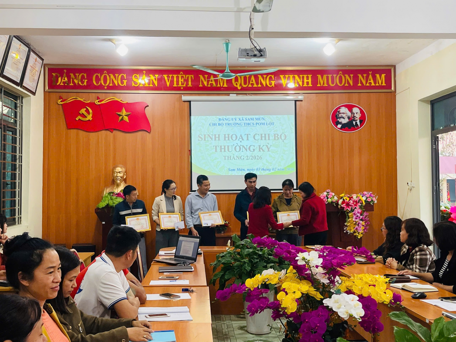 Chiều, ngày 03 tháng 02 năm 2026. Chi bộ trường THCS Pom Lót; xã Sam Mứn sinh hoạt chi bộ thường kỳ tháng 2/2026. Kỷ niệm 96 năm ngày thành lập Đảng Cộng Sản Việt Nam (03/02/1930 – 03/02/2026). Khen thưởng các Đảng viên hoàn thành xuất sắc nhiệm vụ năm 2025.