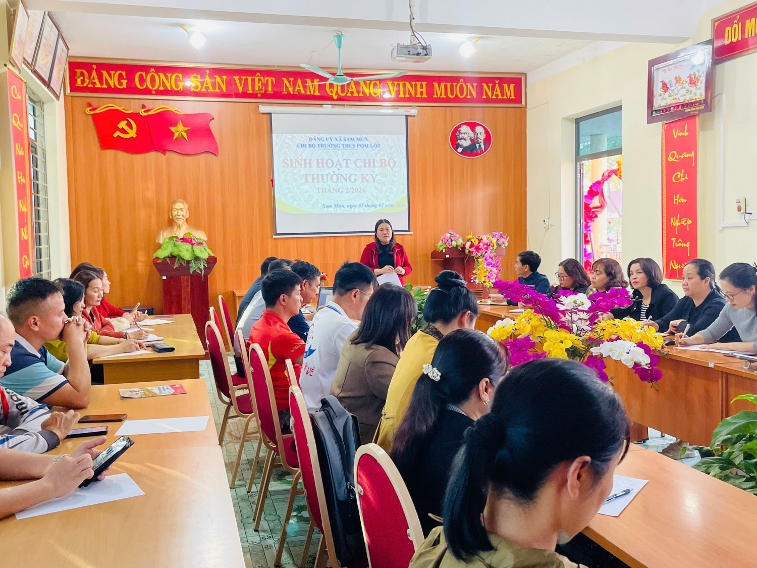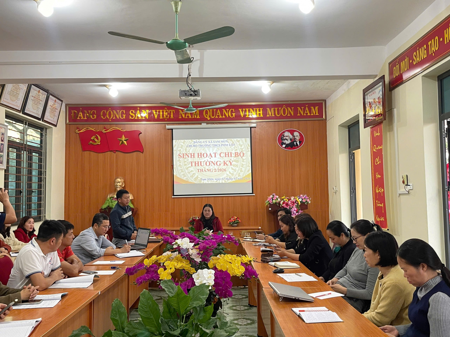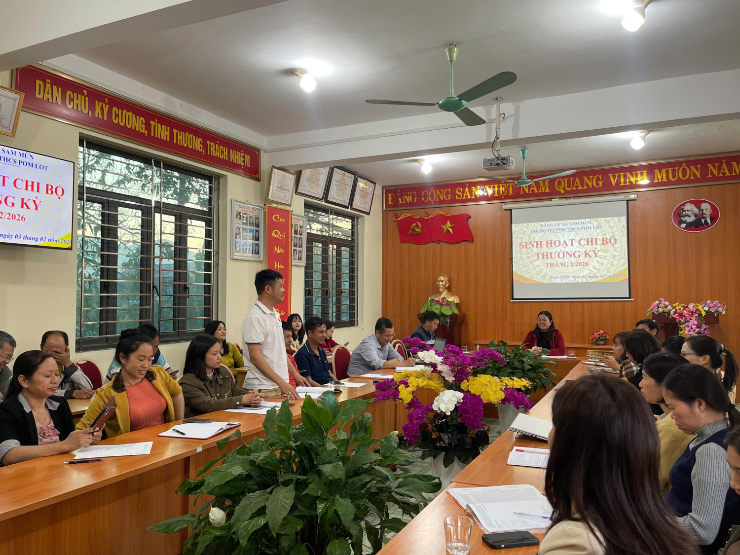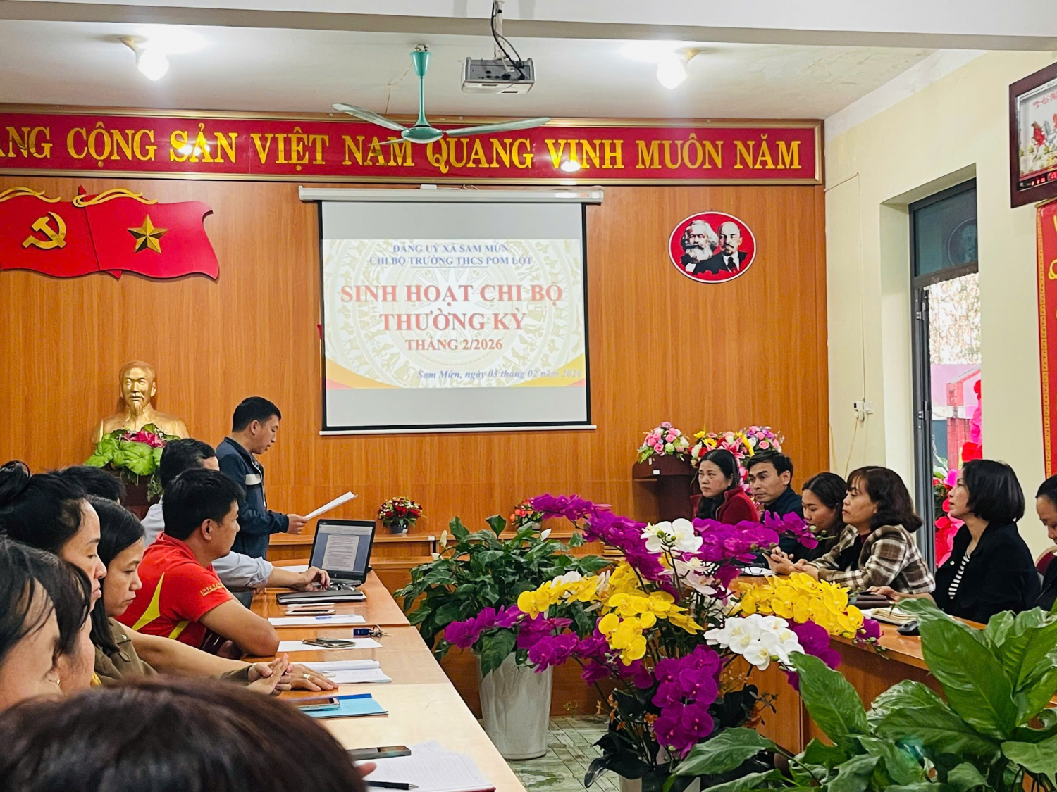 Chiều, ngày 03 tháng 02 năm 2026. Chi bộ trường THCS Pom Lót; xã Sam Mứn sinh hoạt chi bộ thường kỳ tháng 2/2026. Kỷ niệm 96 năm ngày thành lập Đảng Cộng Sản Việt Nam (03/02/1930 – 03/02/2026). Khen thưởng các Đảng viên hoàn thành xuất sắc nhiệm vụ năm 2025.